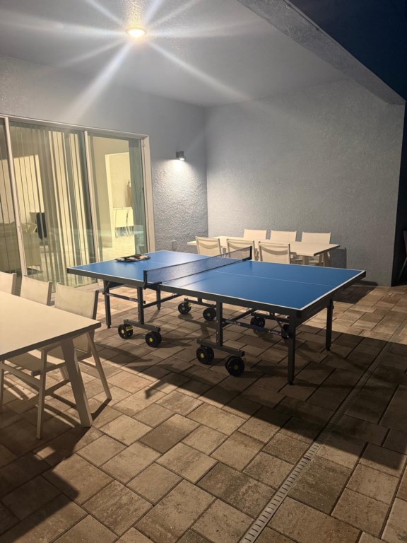 Large family loft room with pool table, smart TV, high top table and chairs, and triple sliding doors leading to rear balcony overlooking the pool.