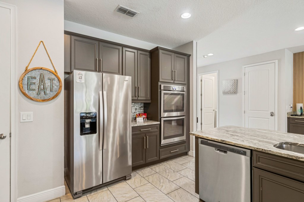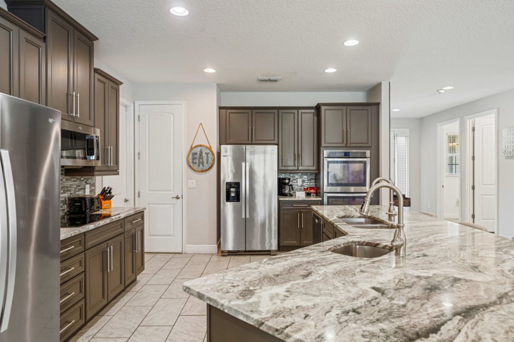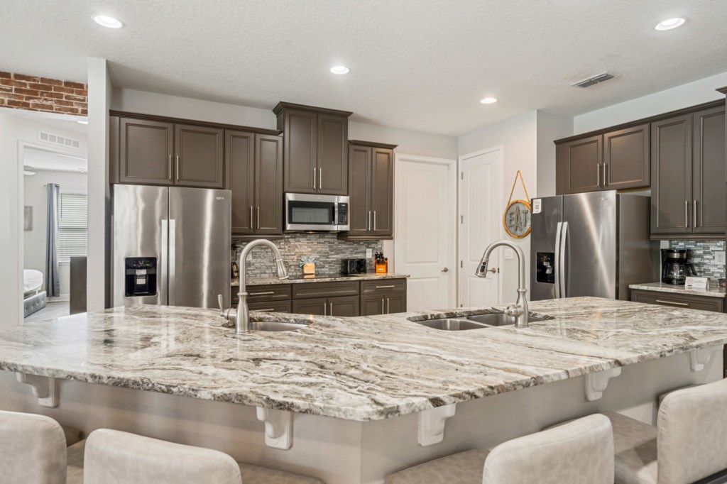 • Gourmet kitchen with an oversized granite island, two ovens, two sinks, two dishwashers and two refrigerators