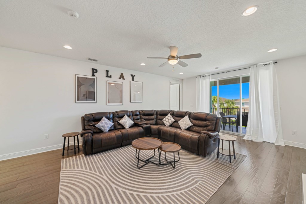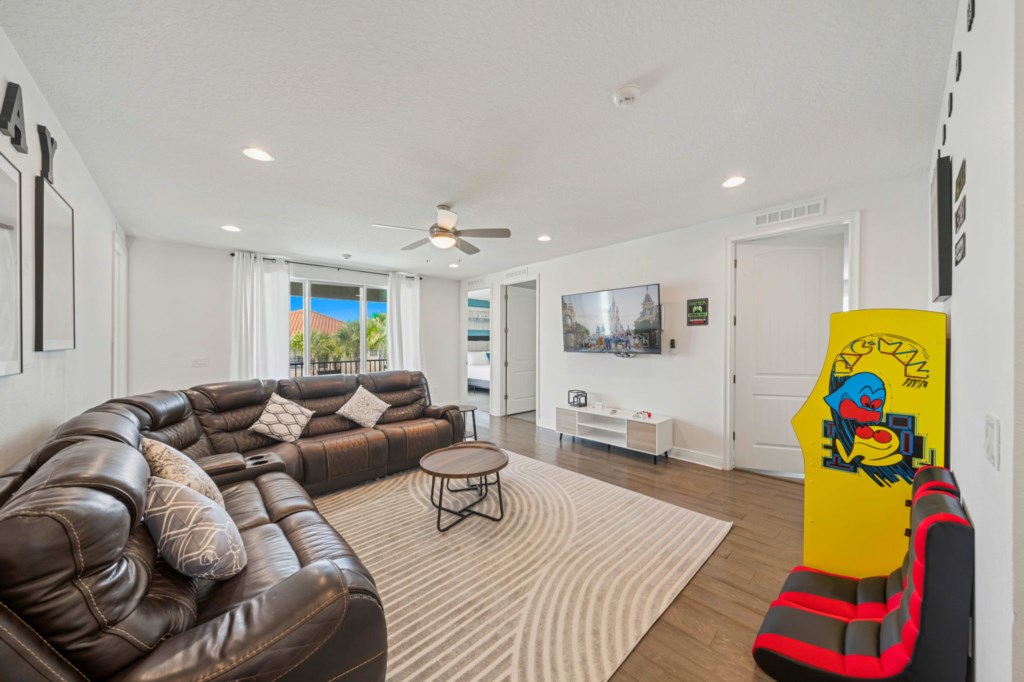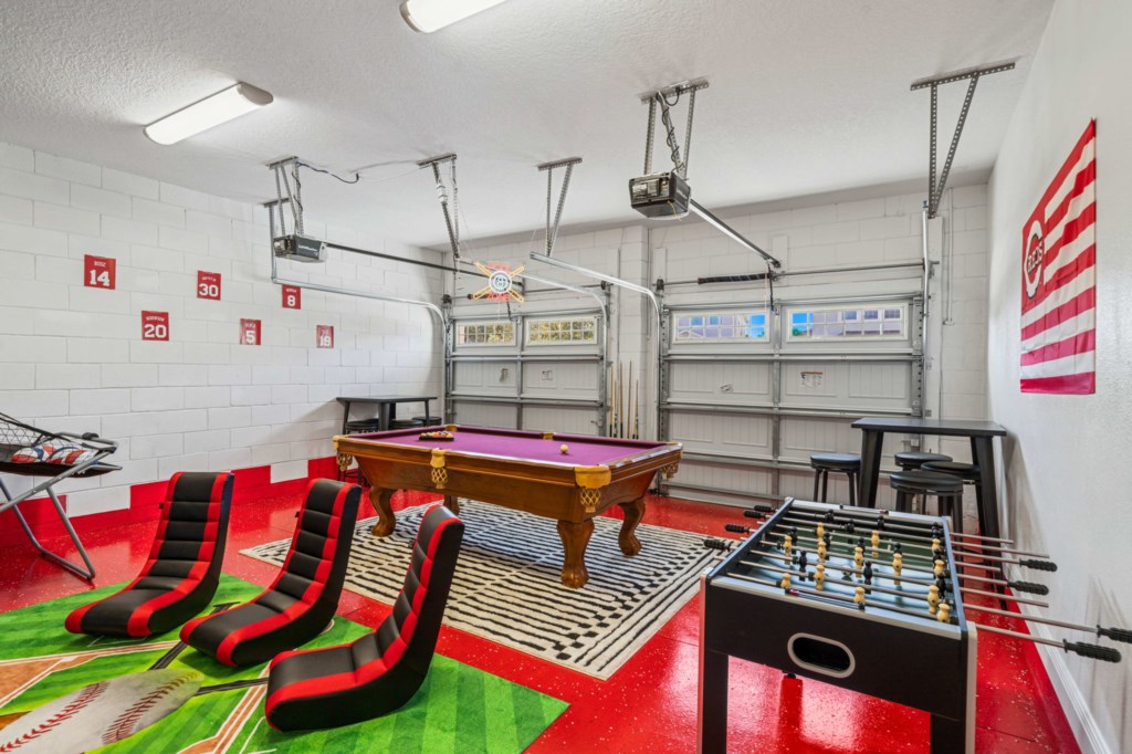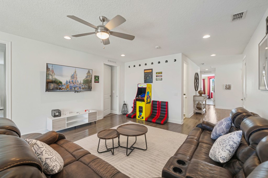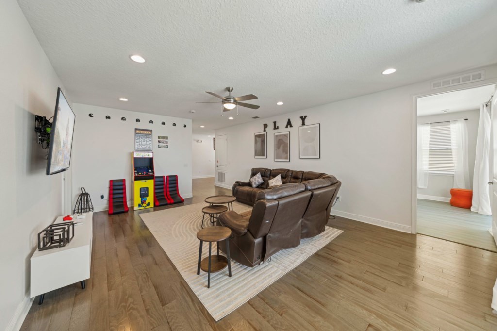 With 5,496 sq ft of living space thoughtfully arranged over just two floors, the home boasts an expansive open-plan layout on the main level, featuring a fully equipped gourmet kitchen with premium stainless steel appliances, a large dining area that seats up to 14 guests, and a generous lounge space that flows seamlessly out to the pool deck through oversized glass sliders. Also on the first floor is a themed games room outfitted with arcade game, Basketball game, Pool table and a large screen TV, ensuring entertainment for all ages.