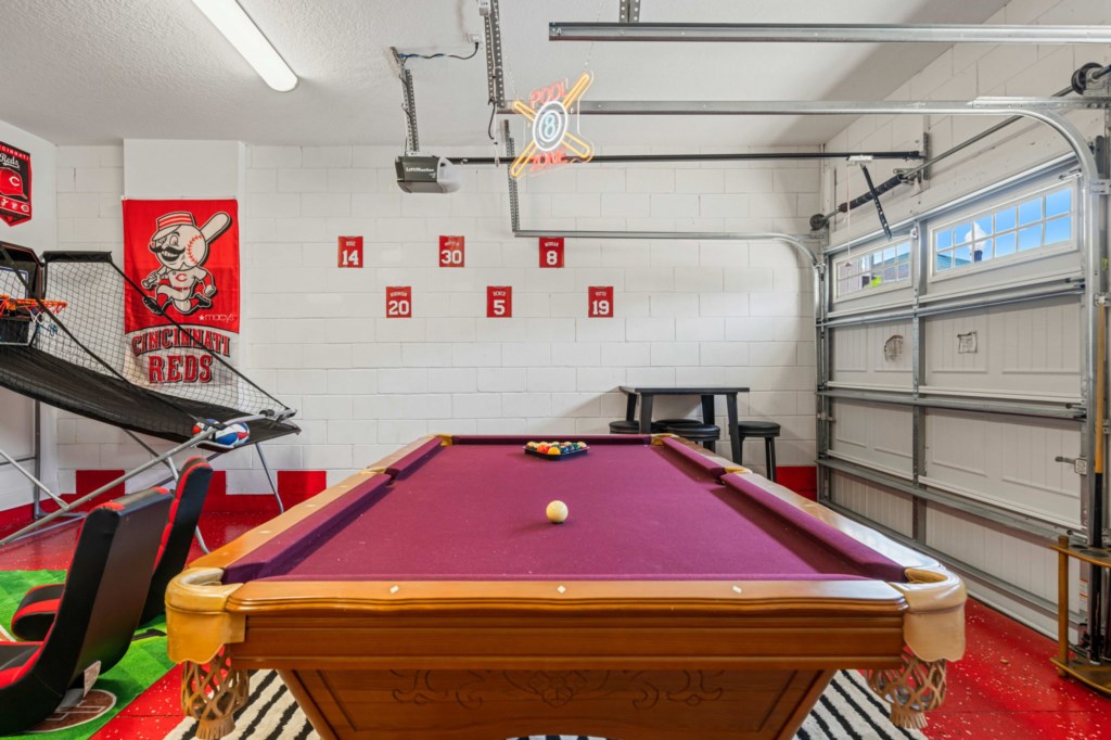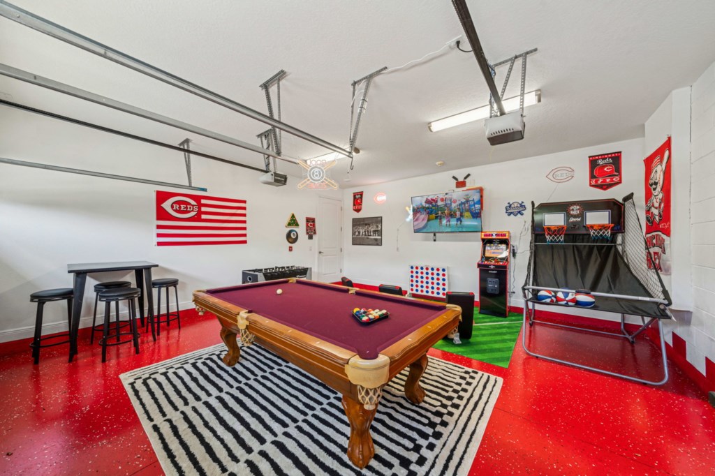 • Air-conditioned game room with classic arcade machines, Pool table and basketball game