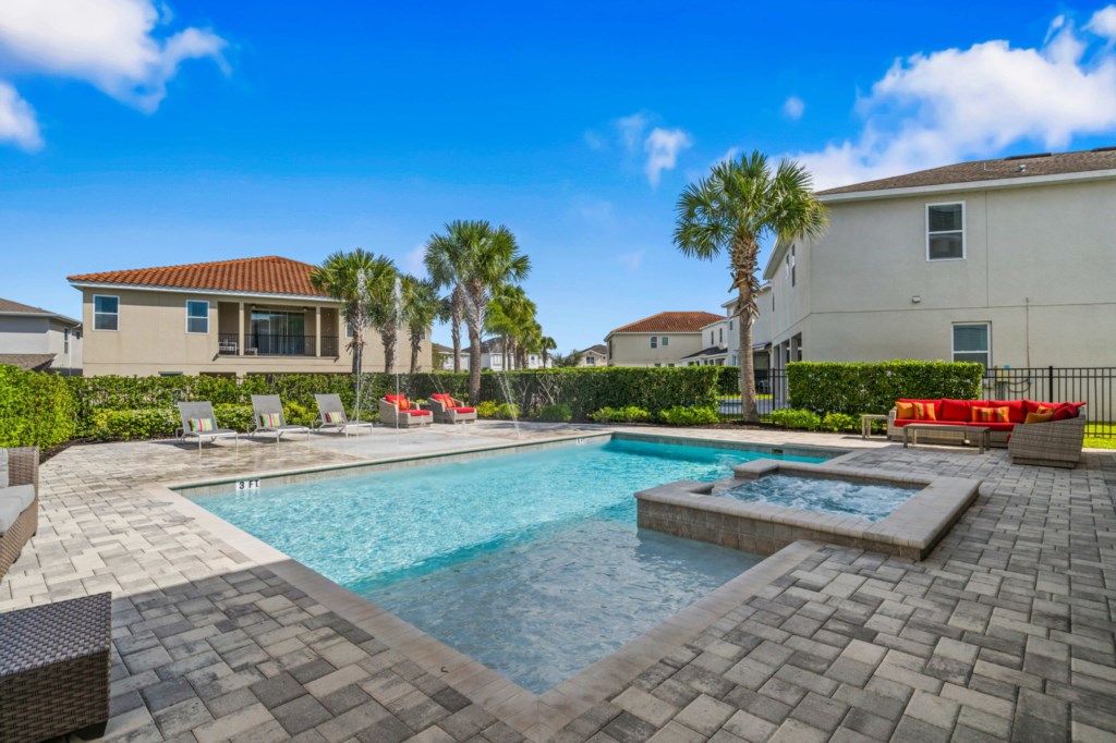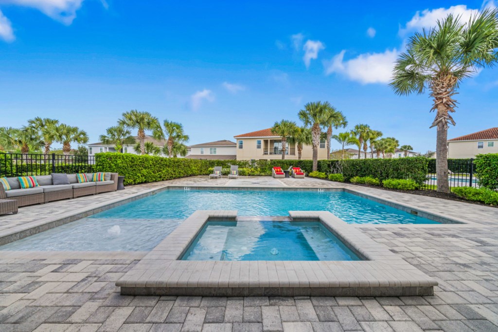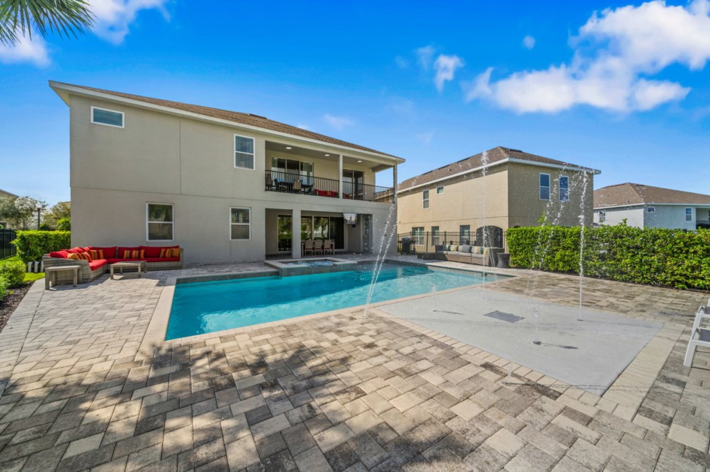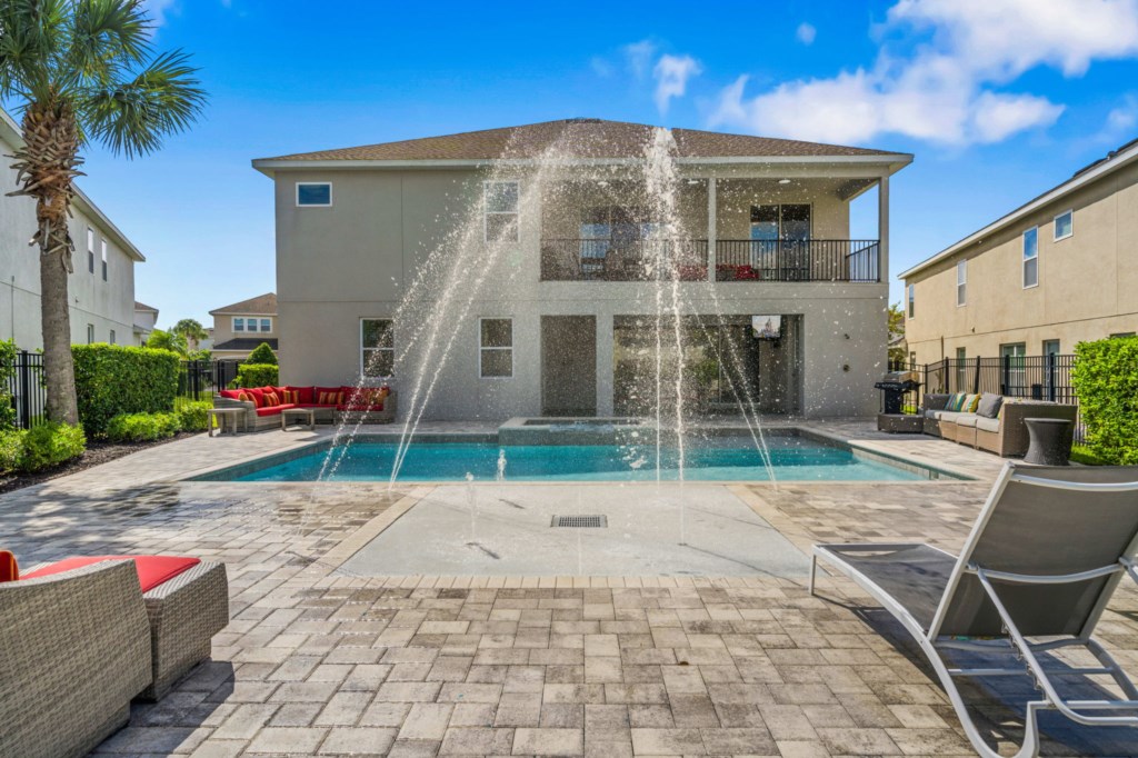 • Private pool with spillover spa (heat optional), kids splash pad surrounded by an oversized pool deck with multiple lounge chairs, an outdoor TV and pool bathroom