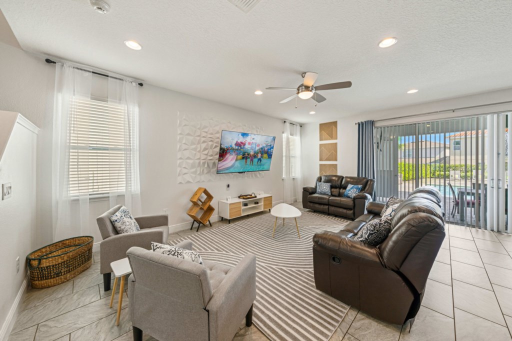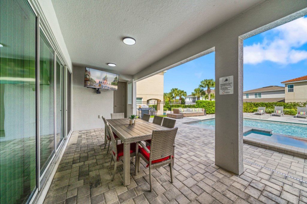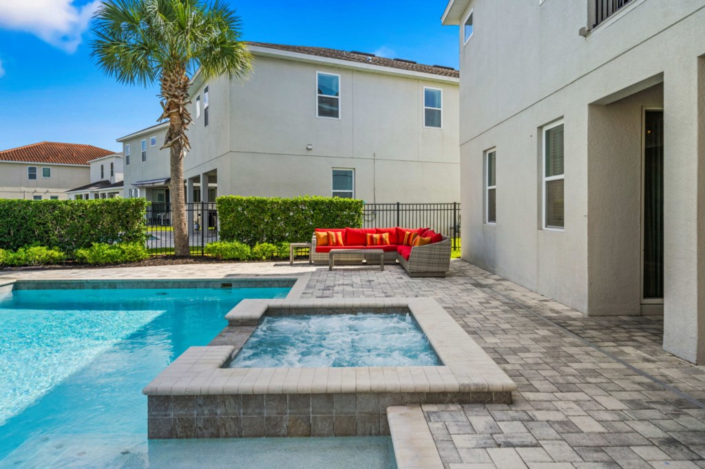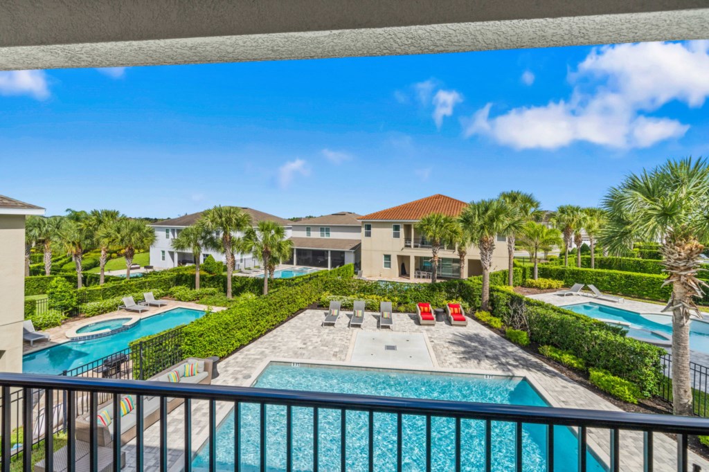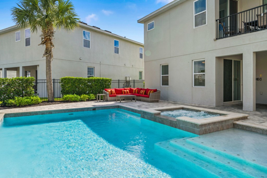 • Private pool with spillover spa (heat optional), kids splash pad surrounded by an oversized pool deck with multiple lounge chairs, an outdoor TV and pool bathroom
