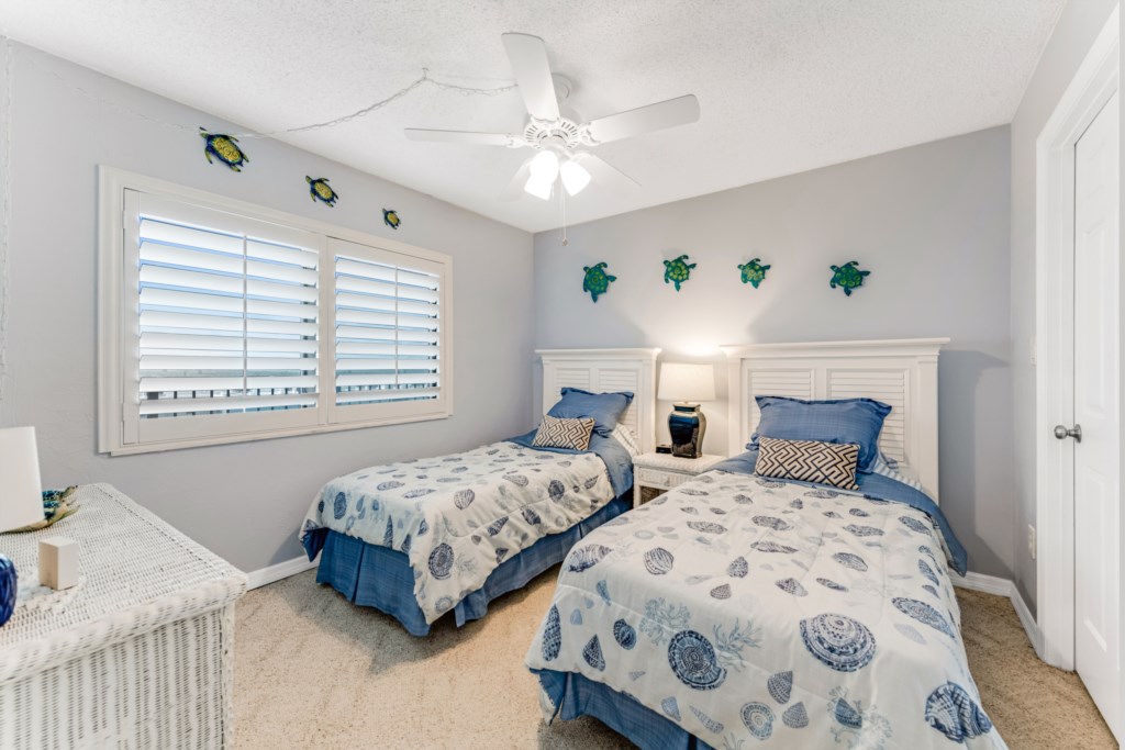 A cozy guest bedroom with two twin beds and a second full bath