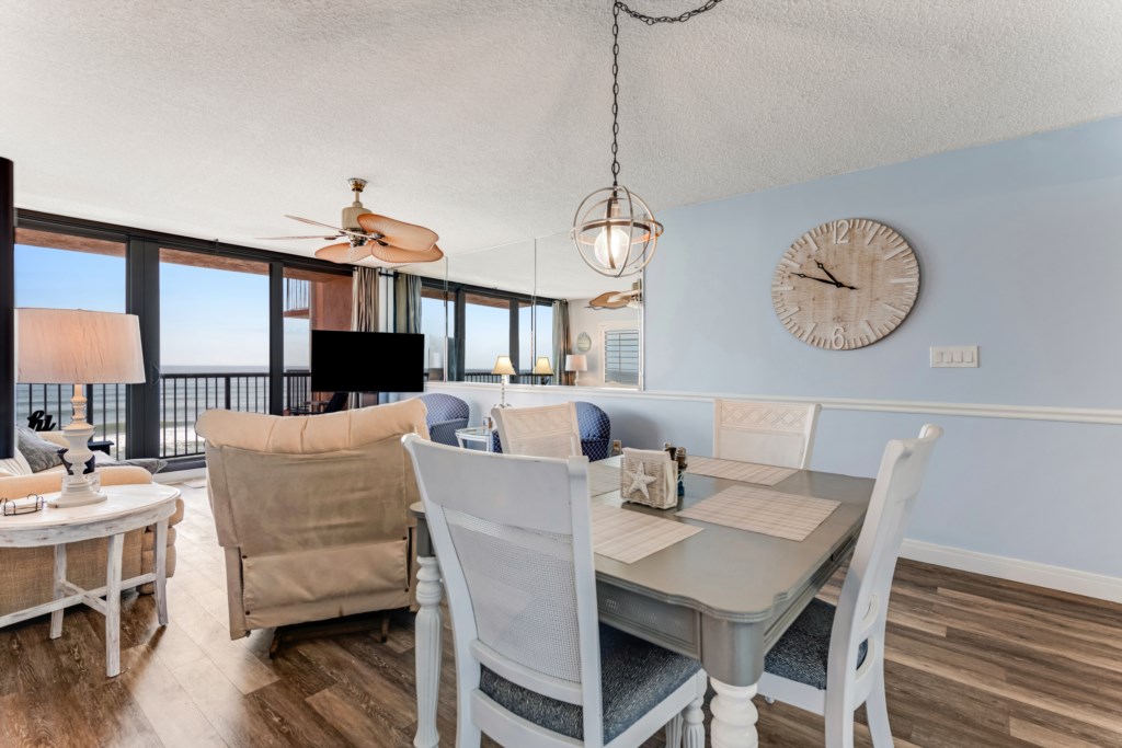 A comfortable open-concept living and dining area with floor-to-ceiling ocean views