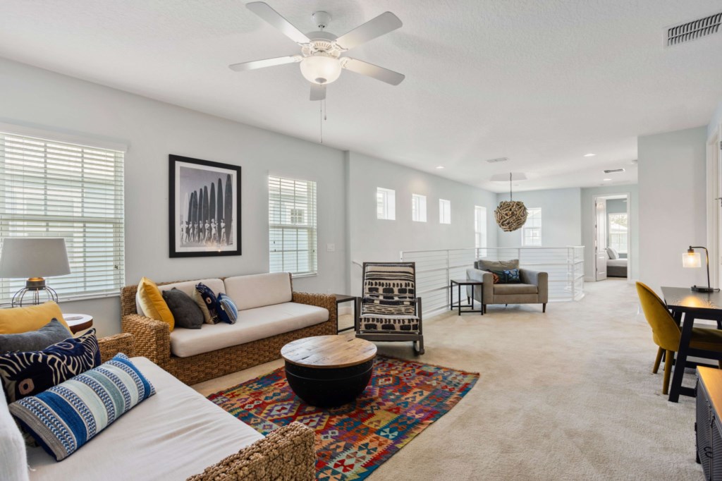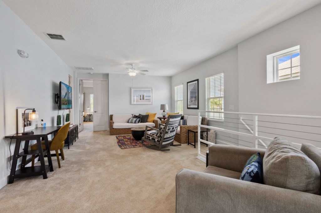 Upstairs loft room with Xbox, TV, sofas and desk