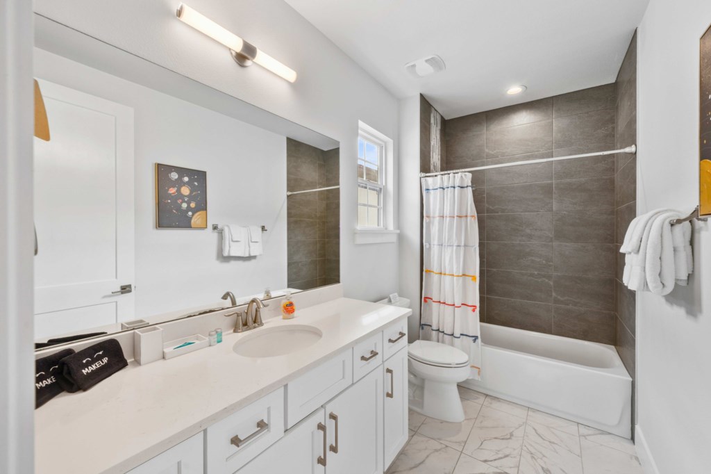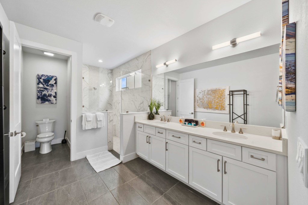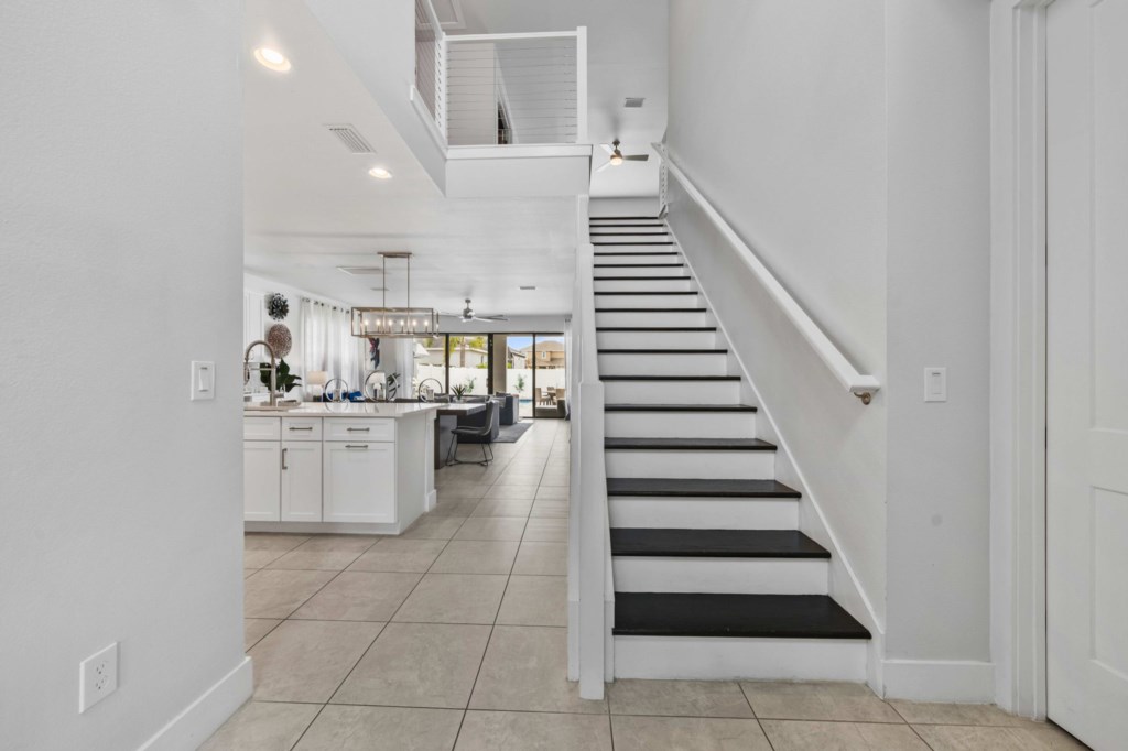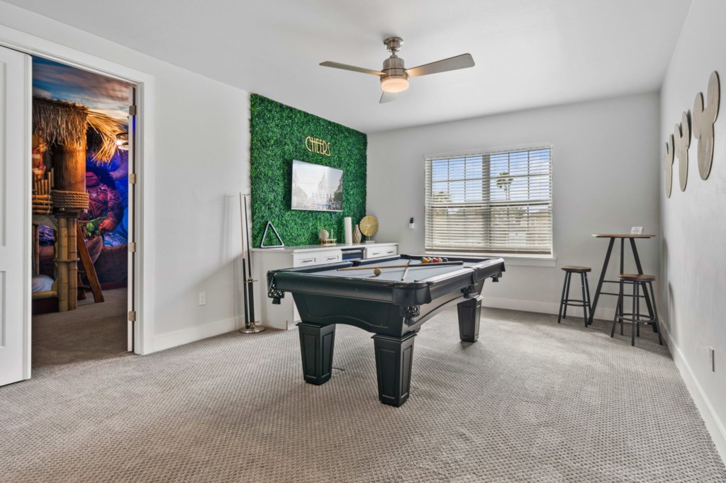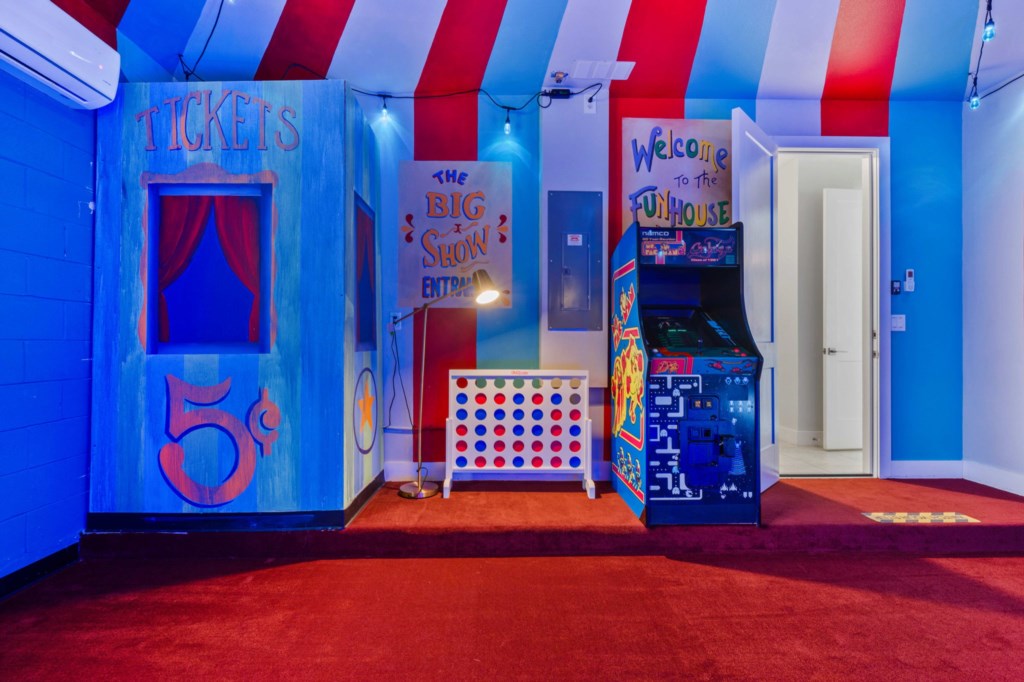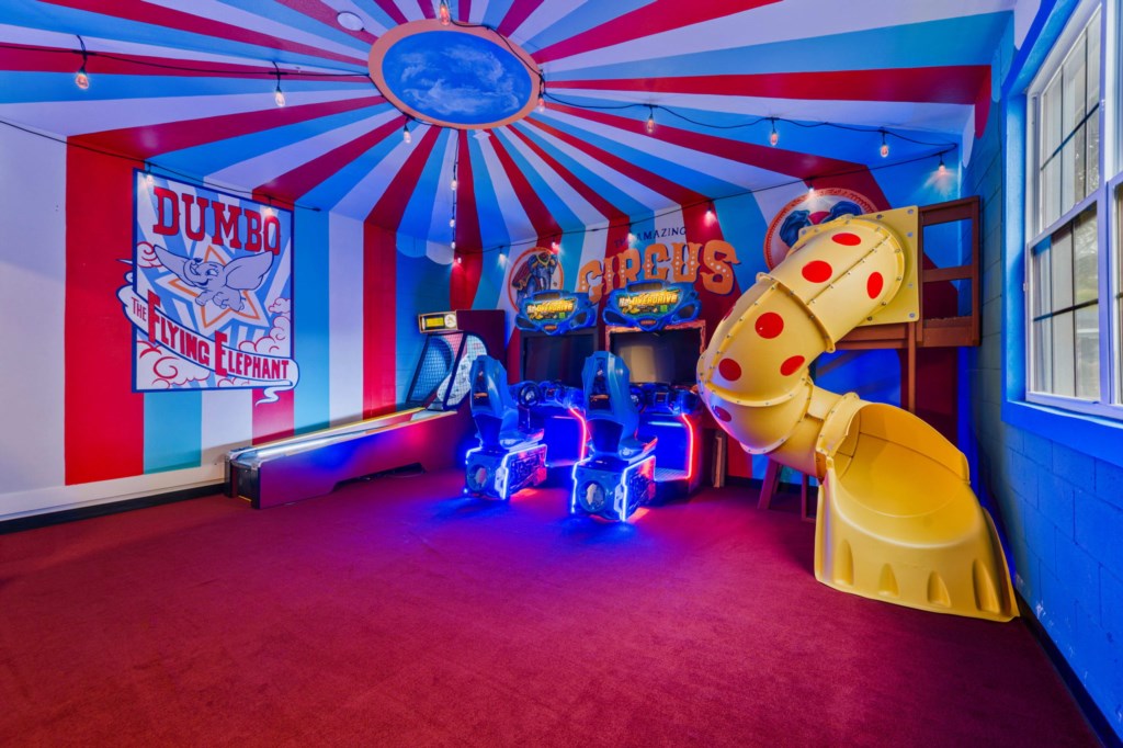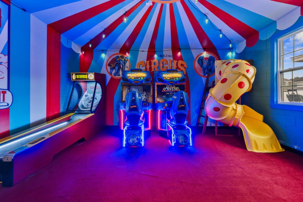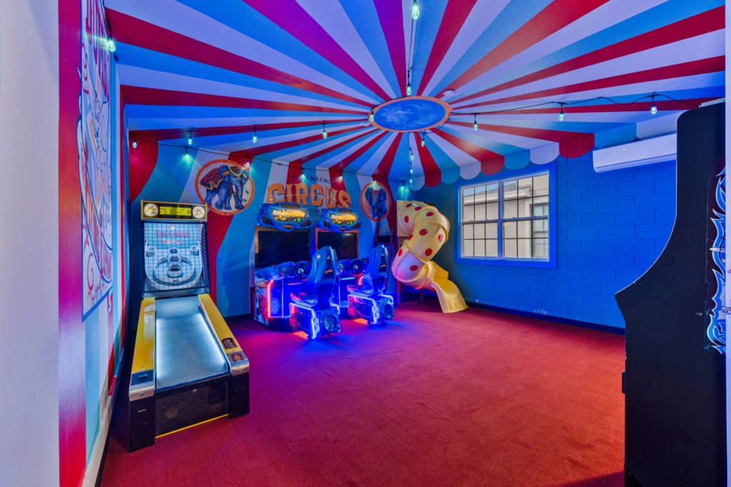 Situated in a quiet, exclusive area of the resort, this beautiful home has been designed to provide the ultimate vacation experience. Downstairs, a large kitchen / family room has a large island unit with seating for 4 people creating a wonderful place to hang out and relax. There is a large TV, sofas and more formal dining table in this space too. The kitchen is fully equipped for cooking at home. Large sliding doors lead directly out to a covered eating area with food prep area, grill and table with seating for 6. The pool deck is arranged around the heated (at extra cost) private pool and hot tub. Downstairs has a Principal King bedroom suite with separate bathroom and closet. There is also the most amazing arcade room with video arcades and a pool table in the bonus room upstairs.