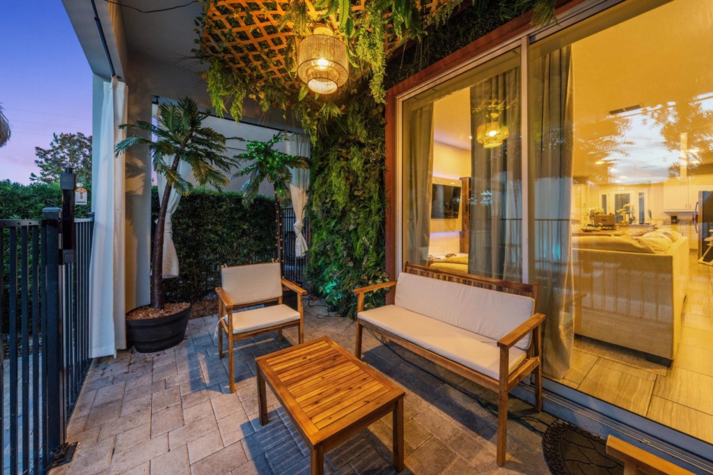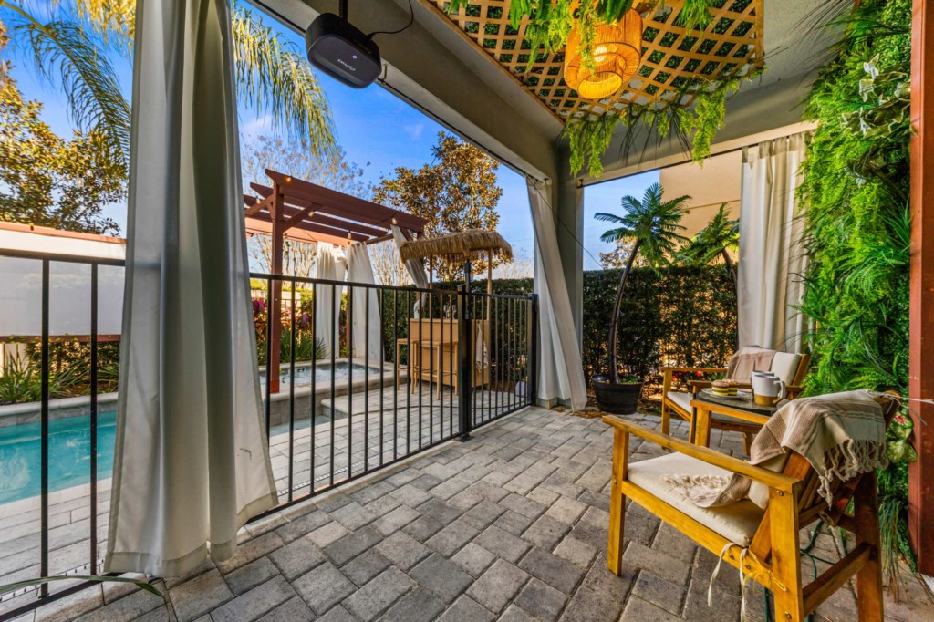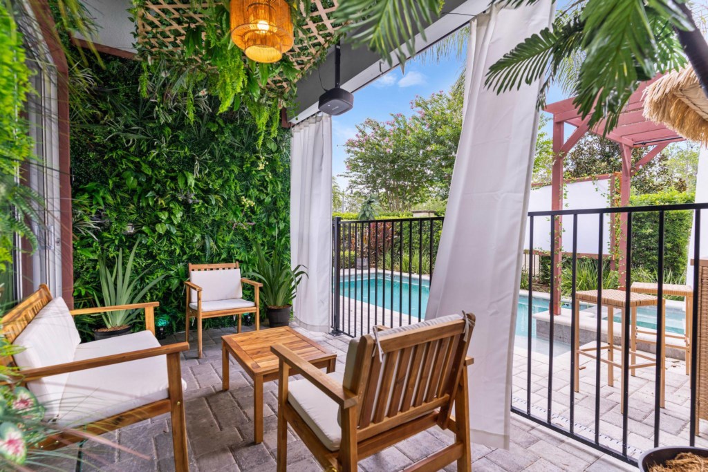 Table & 4 chairs under covered porch on pool deck