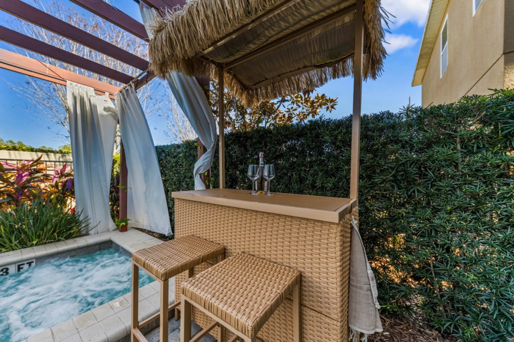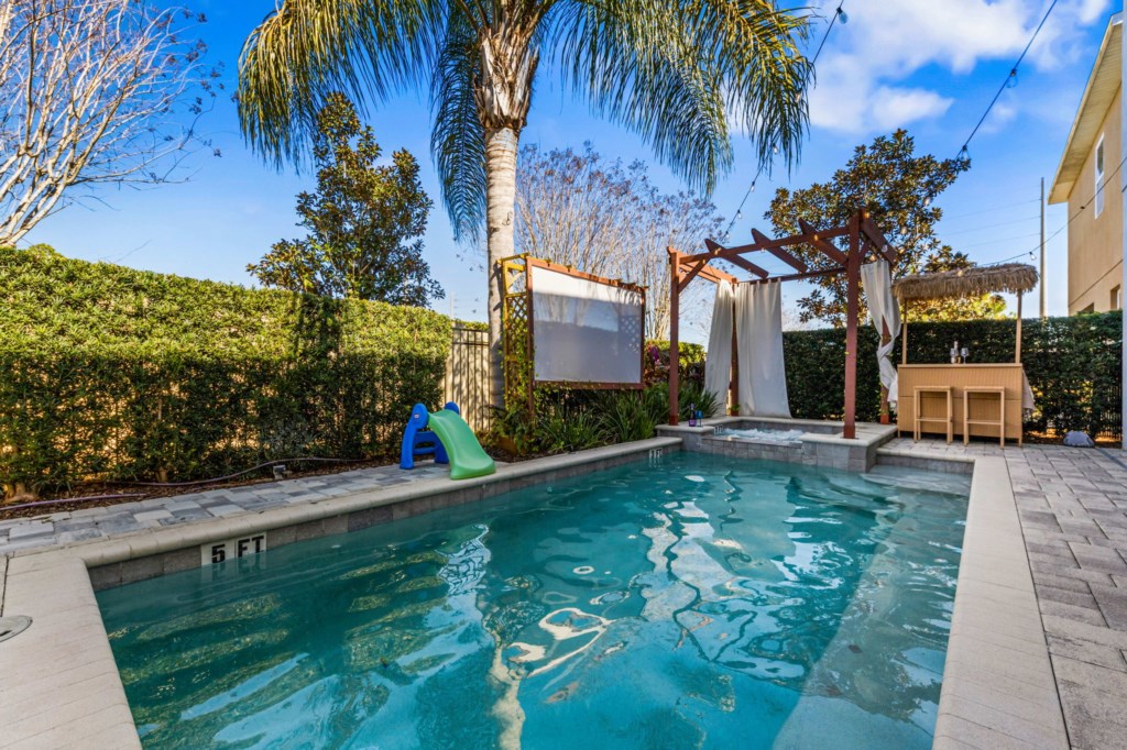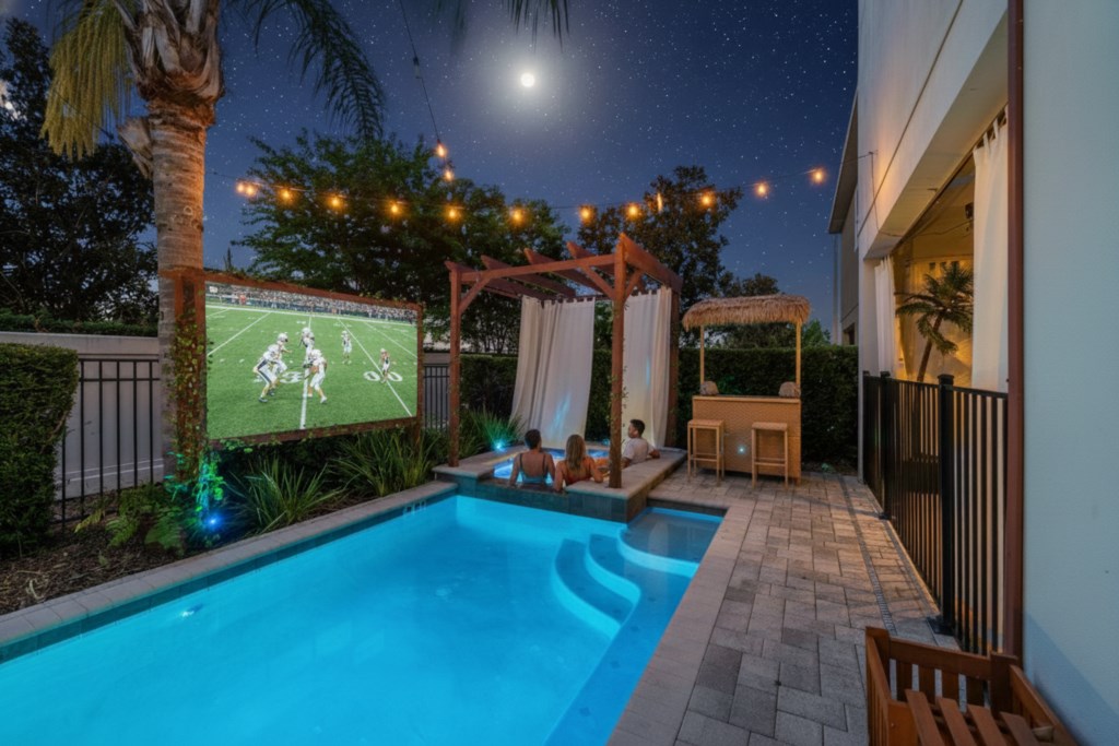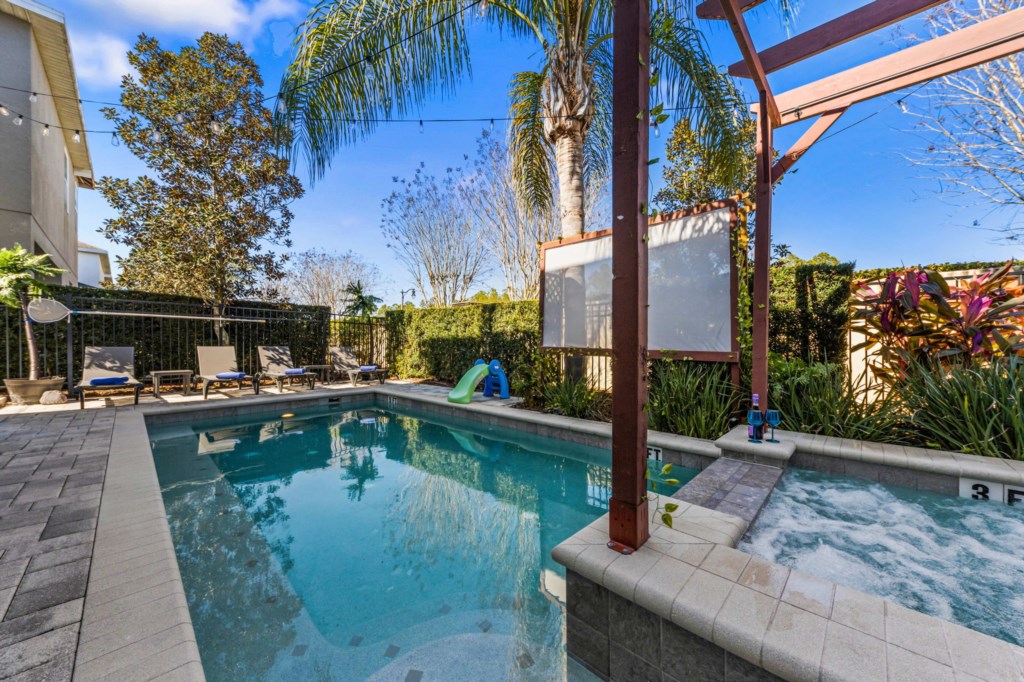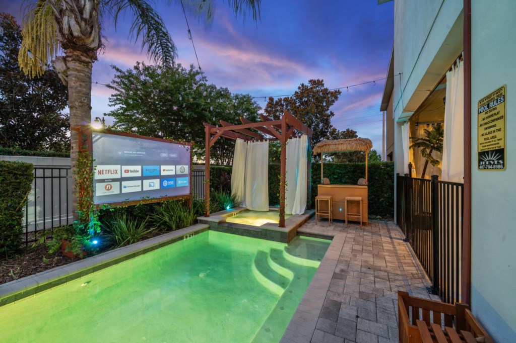 Swimming pool & spa with sun loungers (Pool and Spa can be heated for an additional charge). Outside projector and screen and Tikki Bar