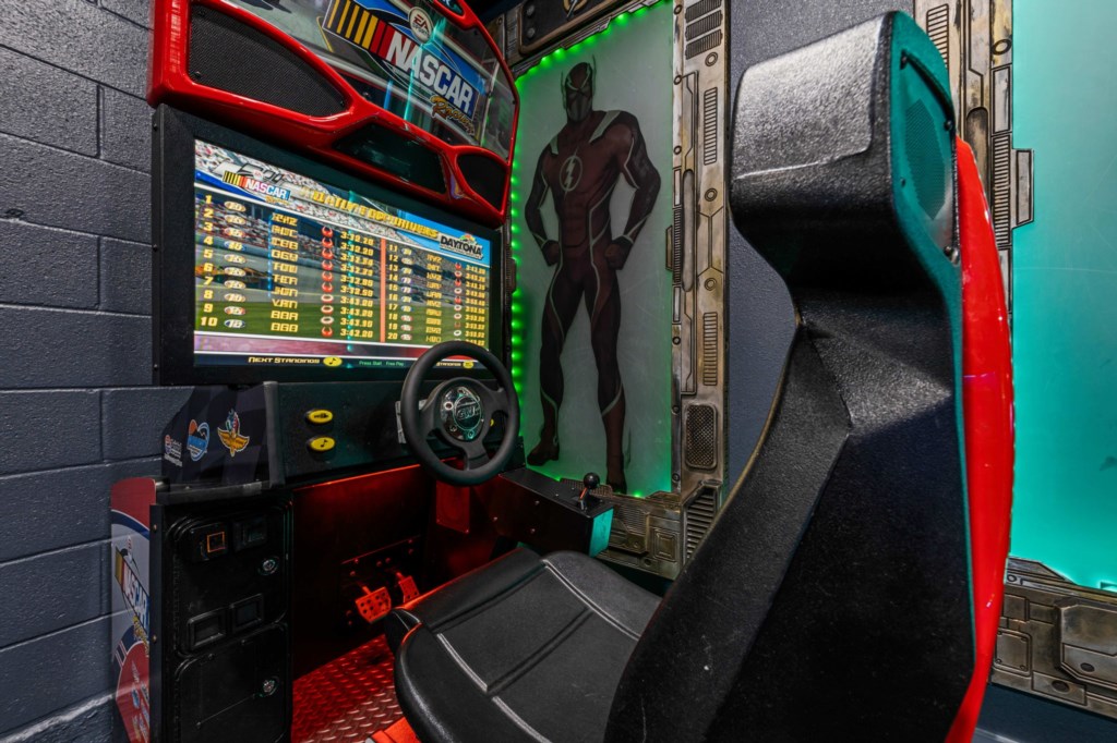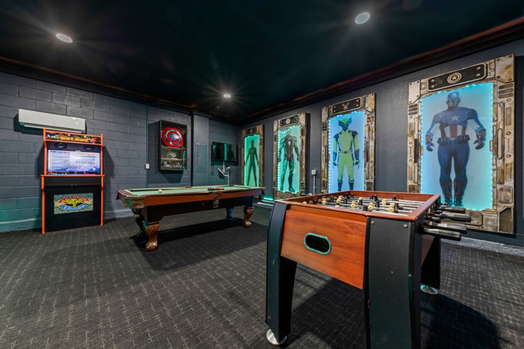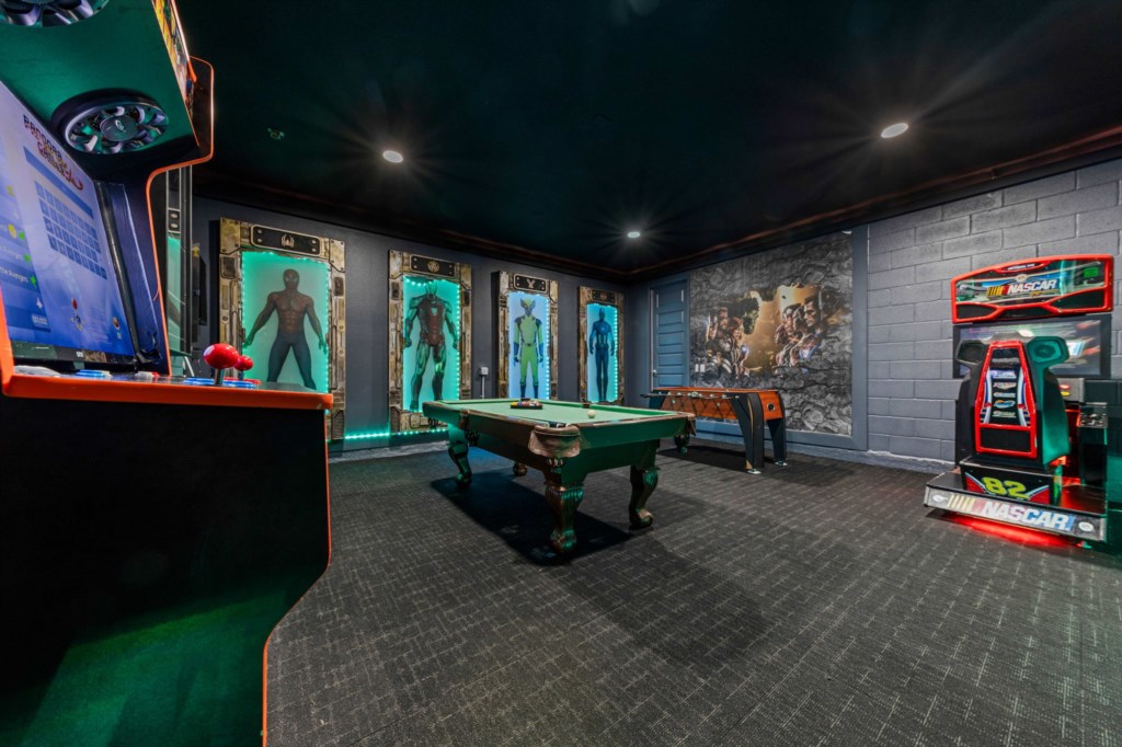 Separate games room with Pool table, Retro Arcade Game, Nascar Arcade game, Foosball, TV with Nintendo Switch and fully air conditioned.