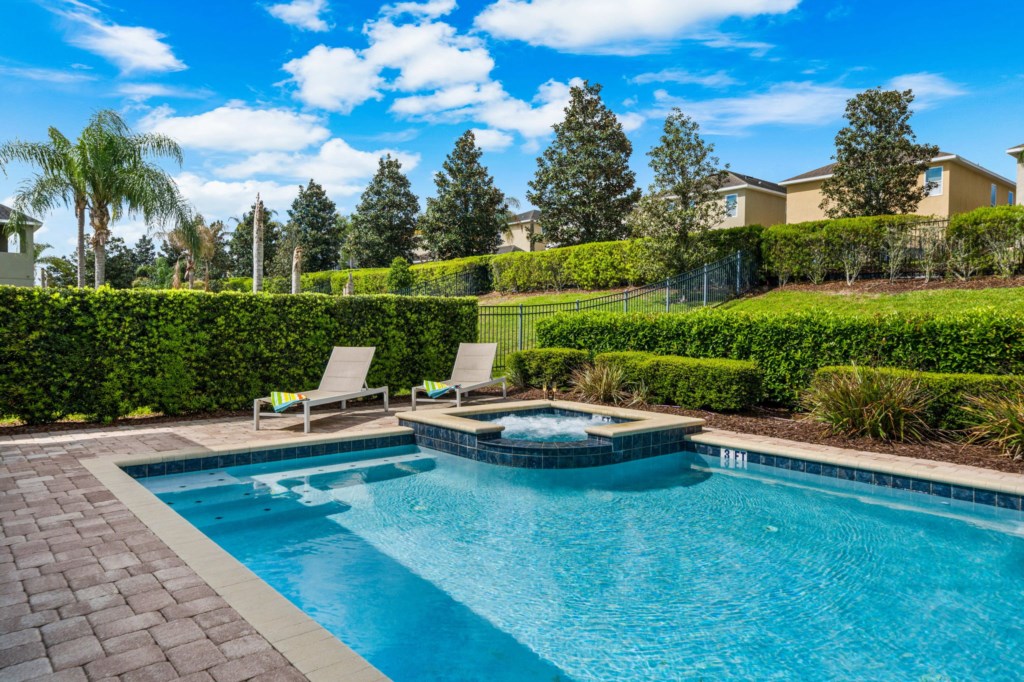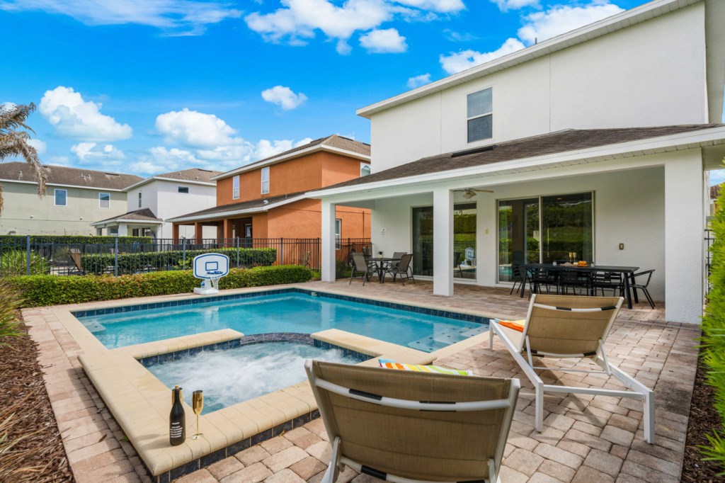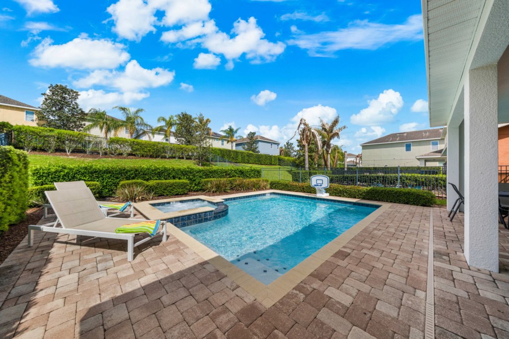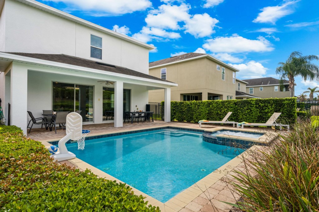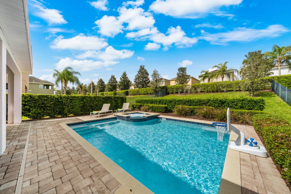 • Private pool with spillover spa (heat charge is optional), surrounded by a pool deck with lounge chairs and pool basketball hoop.