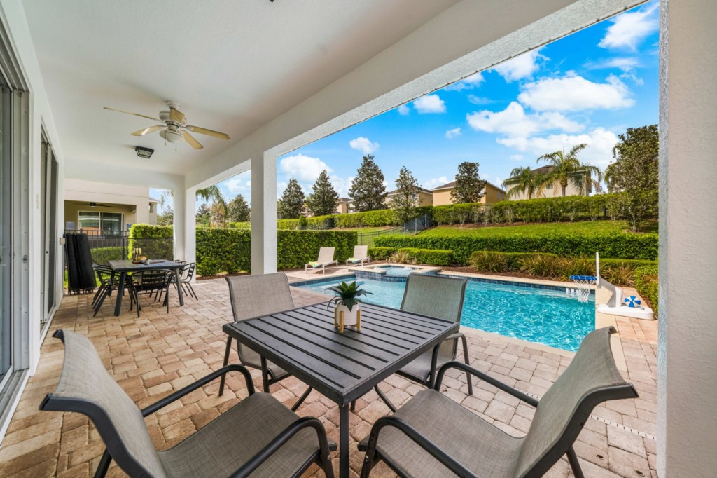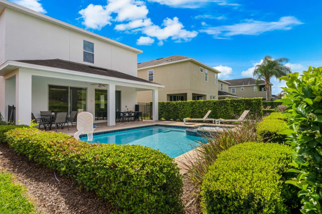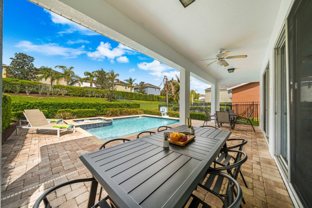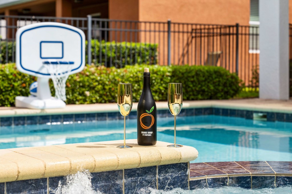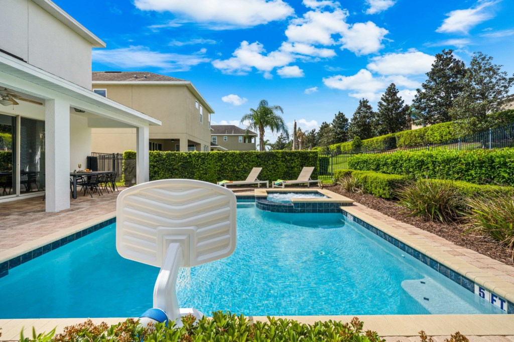 • Private pool with spillover spa (heat charge is optional), surrounded by a pool deck with lounge chairs and pool basketball hoop.