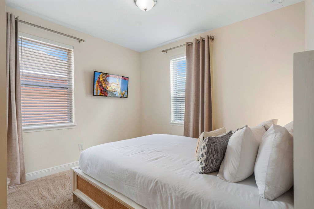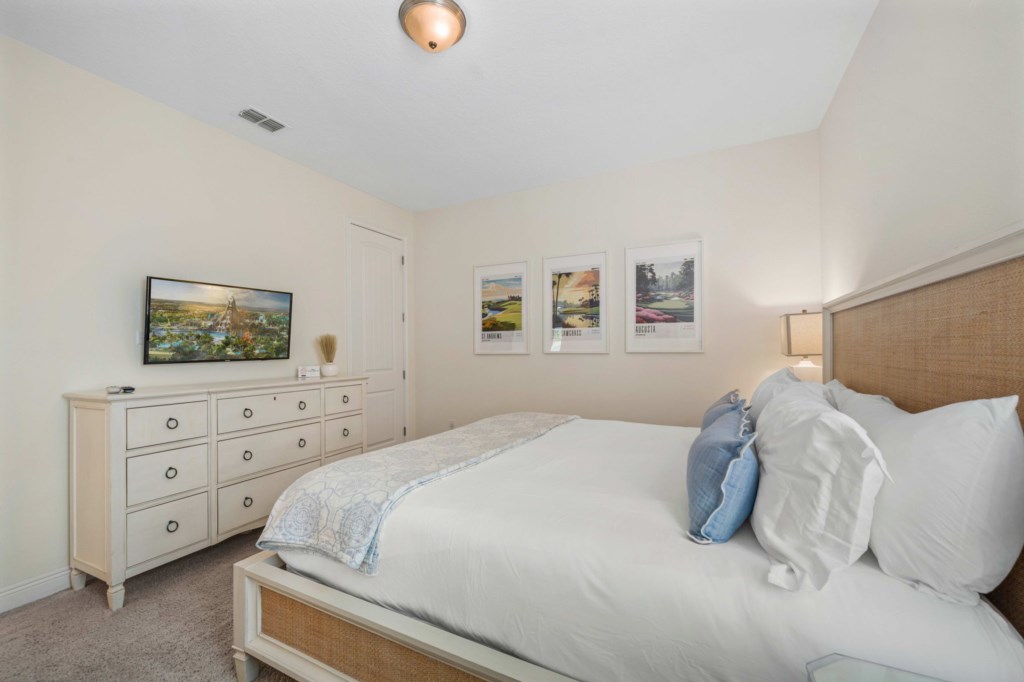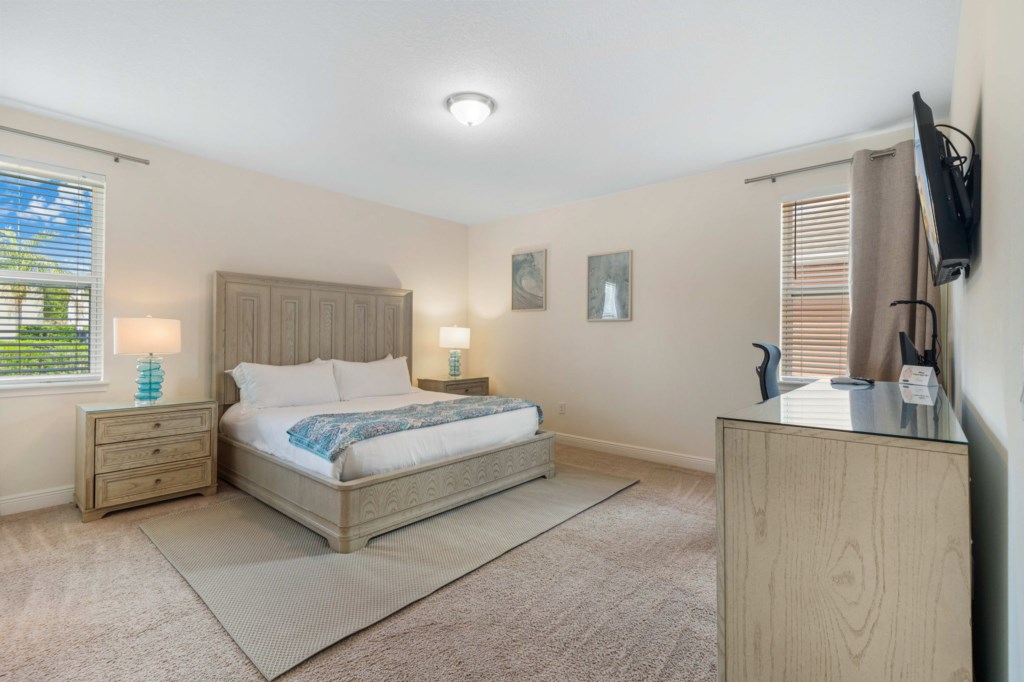 Arranged over two floors only, this beautiful, modern home (2831 sq ft) home enjoys open plan kitchen / dining and hang out space on the first floor, as well as a first floor bedroom with King sized bed. The kitchen is fully equipped with everything you might need to feel like home from home and all the appliances are stainless steel and premium brands. The dining table can accommodate up to 8 people seated for those lavish evenings in. Large glass sliding doors lead out to the pool deck and outside fun.