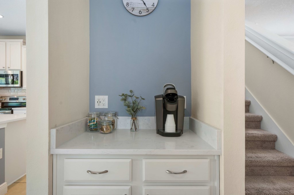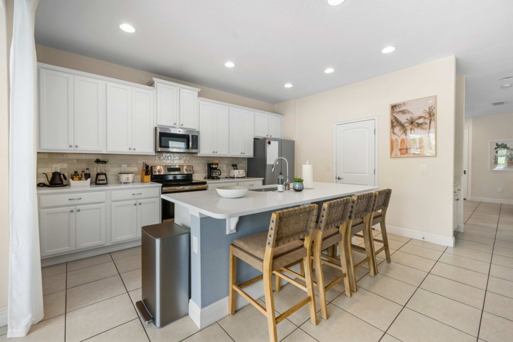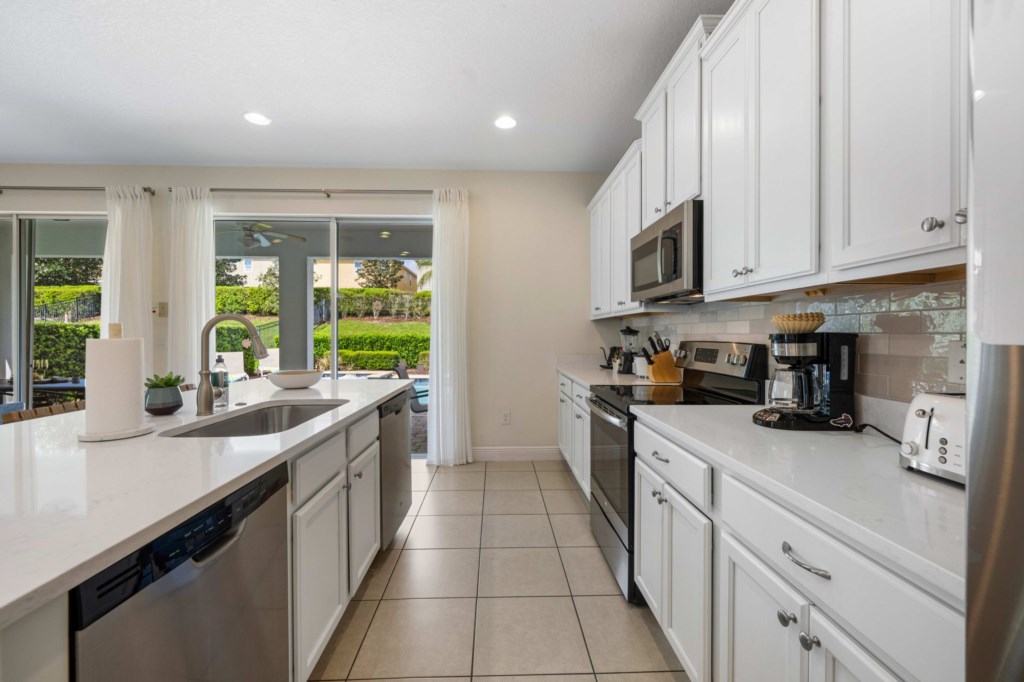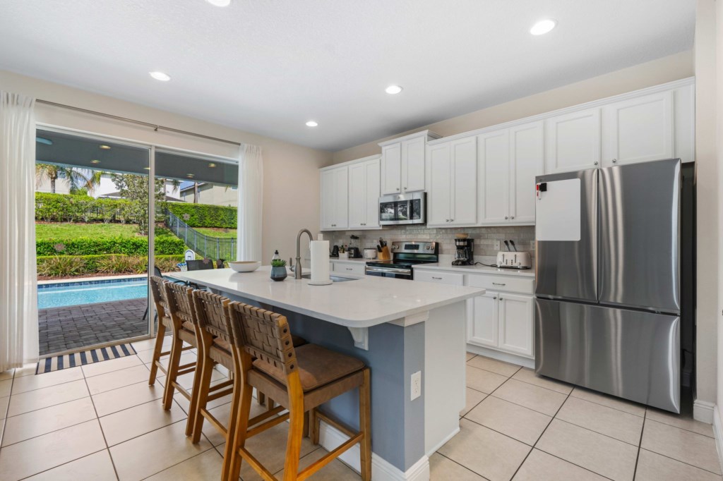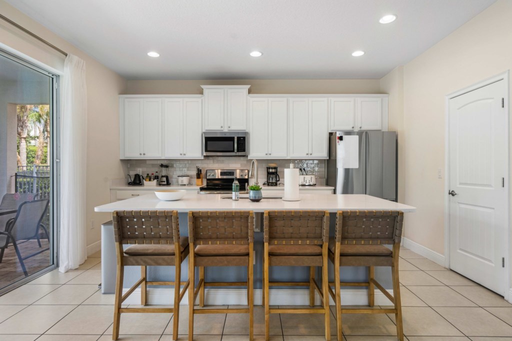 • Gourmet kitchen with granite island, oven, two dishwashers, refrigerator, microwave, drip coffee machine, Keurig and toaster.