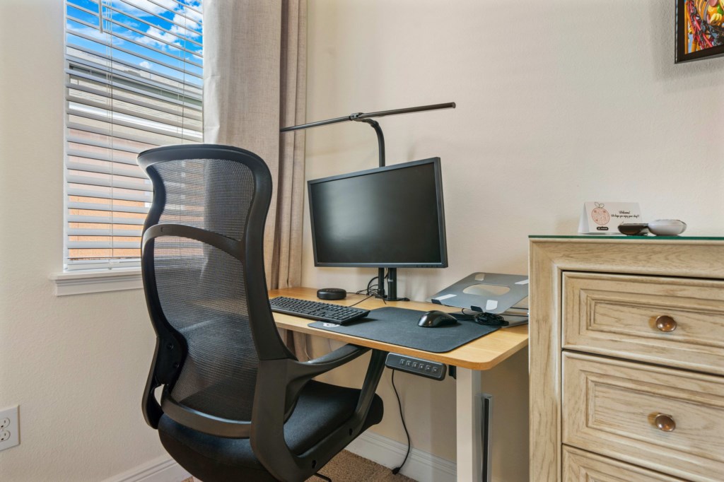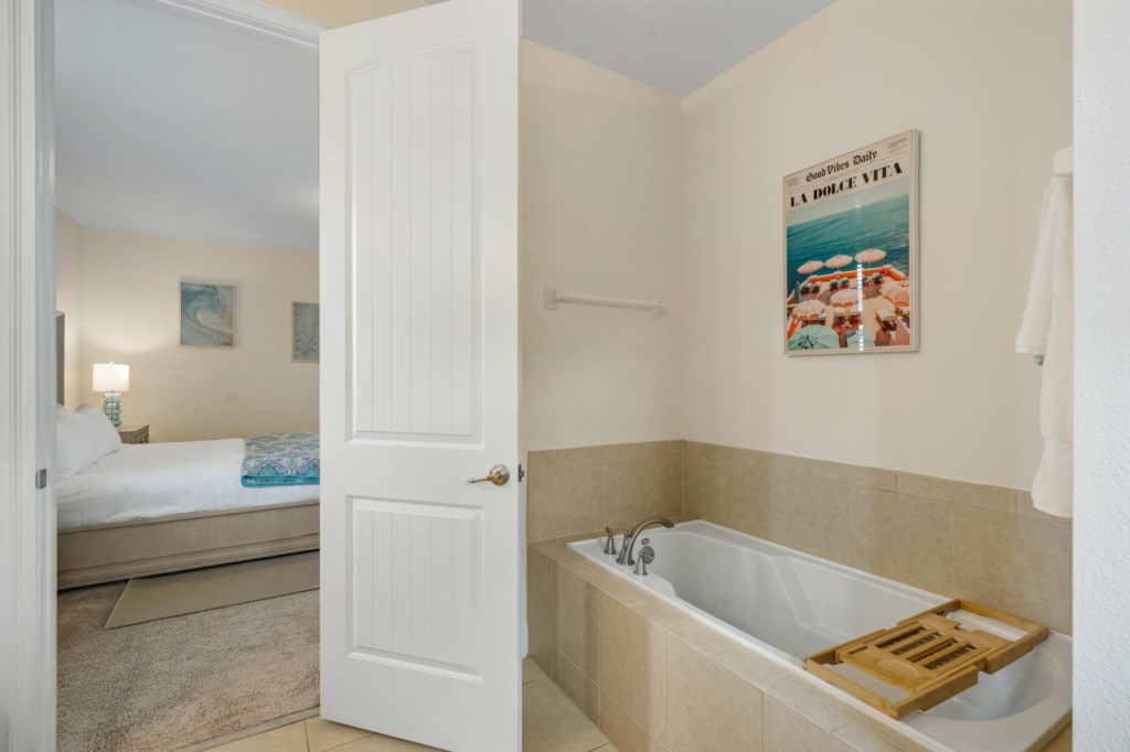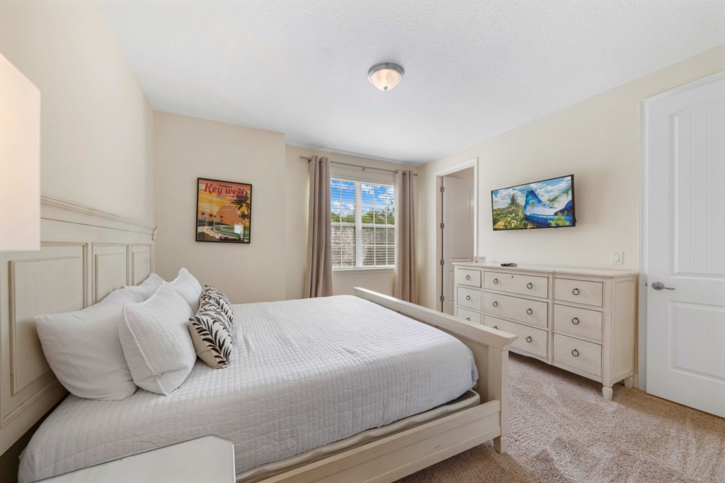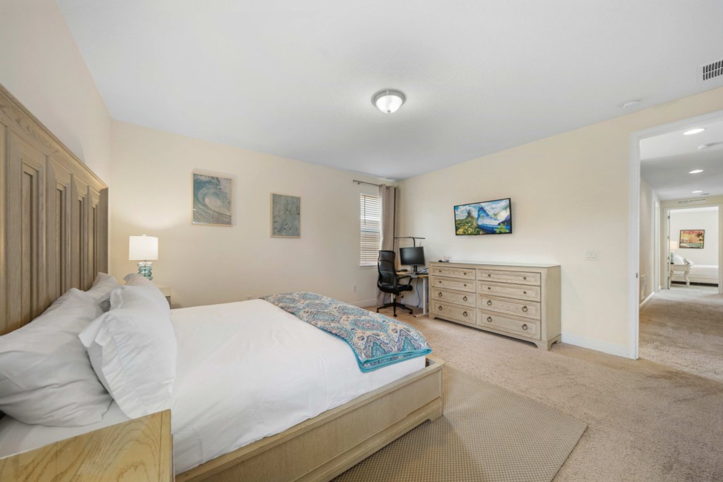 Bedroom 2 - Principal bedroom with King sized bed and ensuite bathroom with tub. Desk area with monitor.