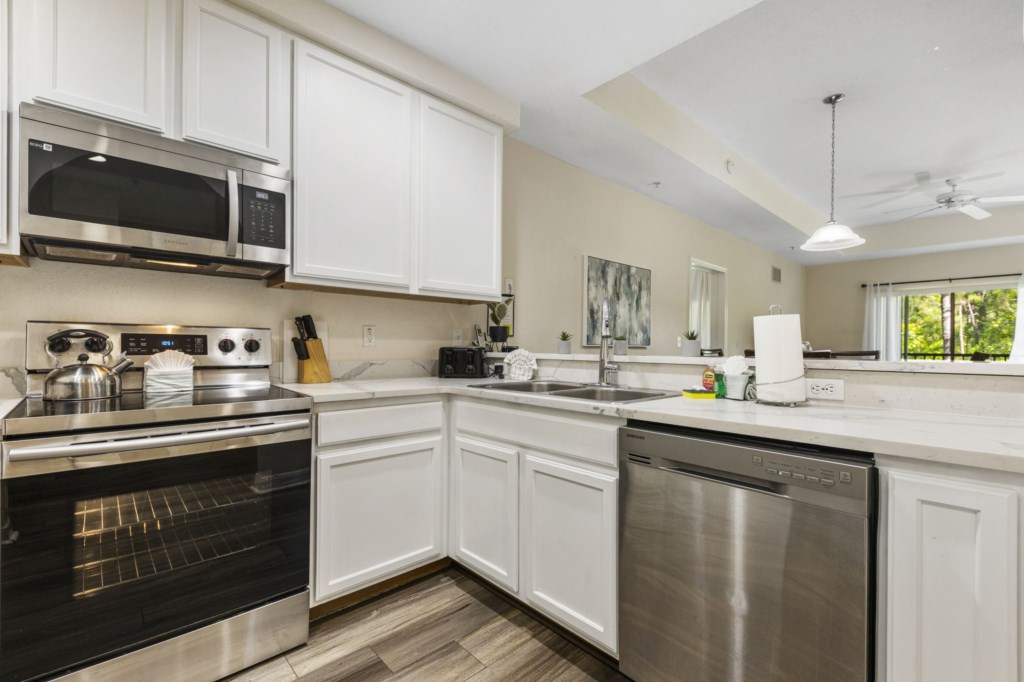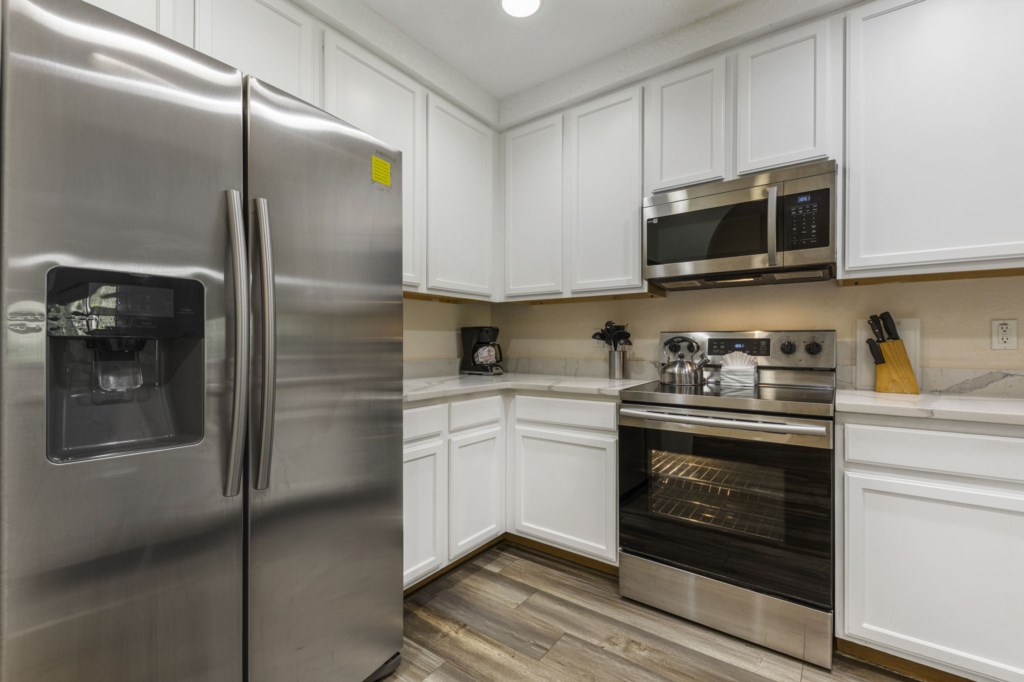 Fully equipped kitchen with refrigerator/ice maker, blender, toaster, dishwasher and stove.