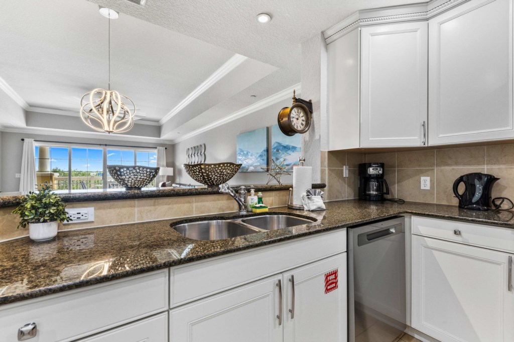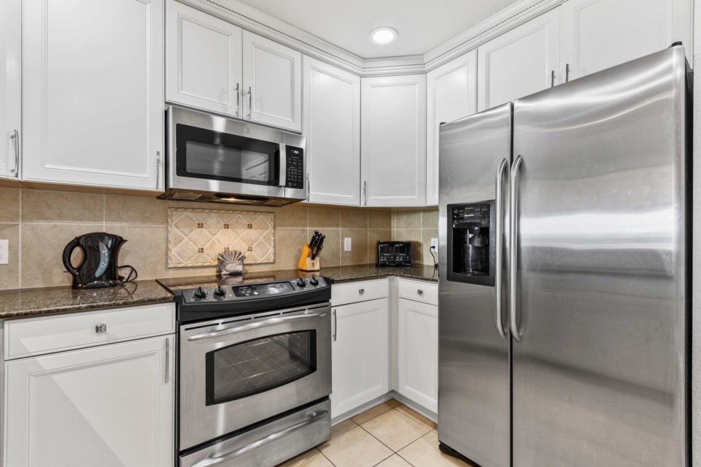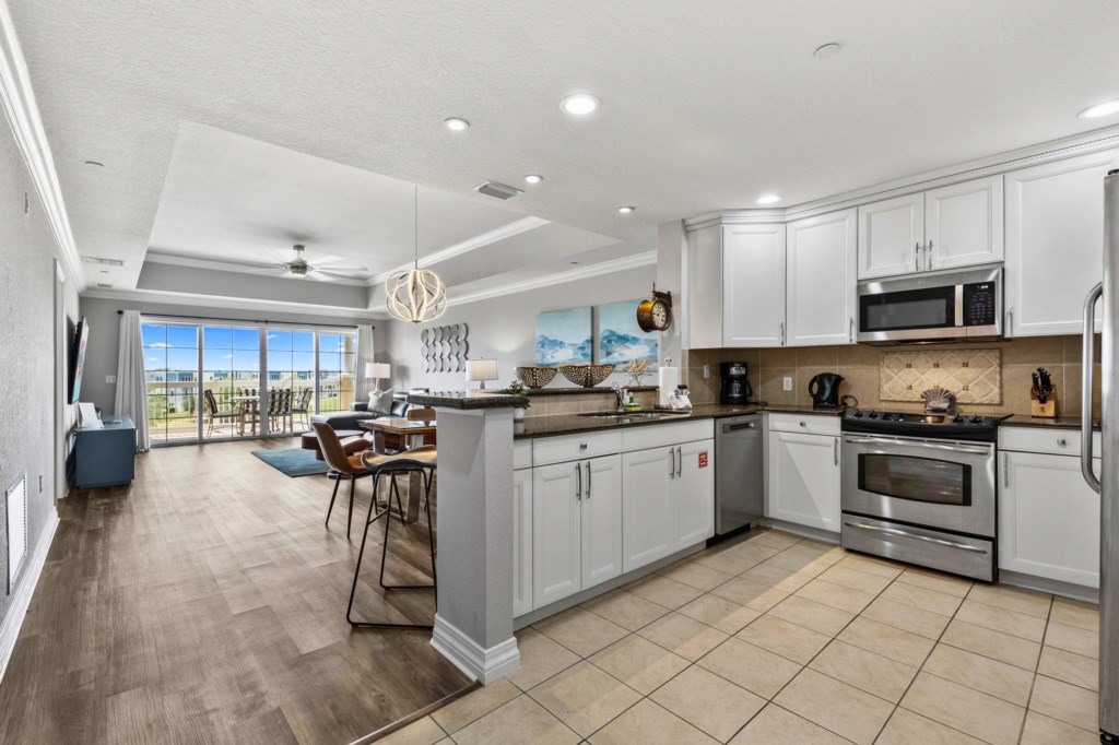 Fully equipped luxury kitchen with refrigerator/ice maker, Keurig Coffee maker, blender, toaster, dishwasher and stove.