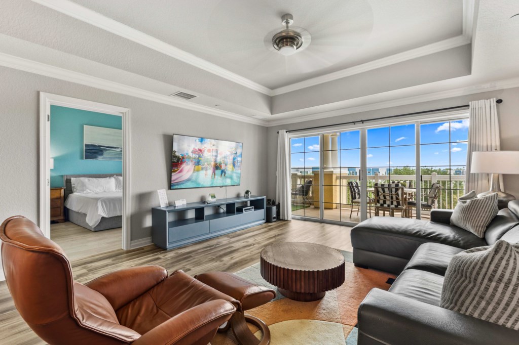 Large family room leading onto rear balcony with seating